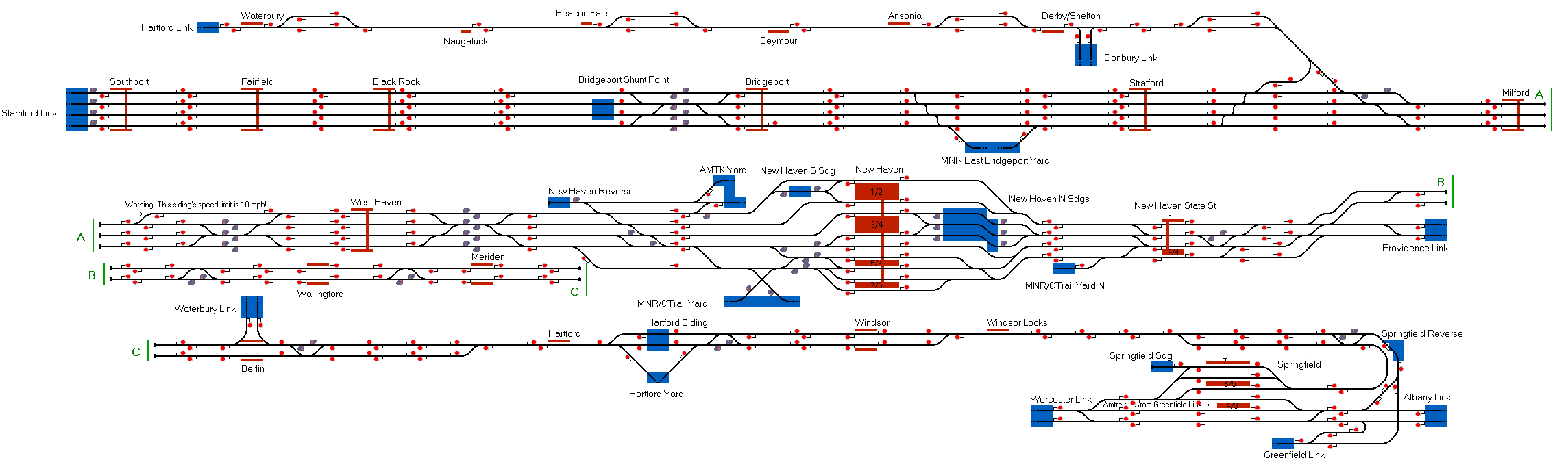 The north end of the historic New Haven Railroad, covering the modern Northeast Corridor from New Haven to Southport, the full Hartford Line, and the Waterbury Branch.