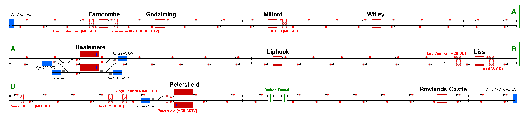 The Portsmouth Direct Line splits from the South Western Main Line at Woking and runs through the South Downs to Portsmouth. This route represents the stretch from Shalford Junction (just south of Guildford) to Havant exclusive.